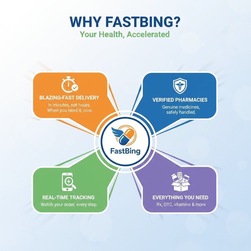 professional care. At FastBing, we believe trust is the most essential ingredient in healthcare. That’s why we don’t operate our own pharmacy; instead, we partner exclusively with a rigorous Verified Network of Licensed Pharmacies in your local area. This strict vetting process is our commitment to your safety. Every single product, from prescription drugs to over-the-counter essentials, is sourced directly from certified, licensed pharmacists. Choose FastBing for genuine products, delivered with unmatched speed and absolute trust.